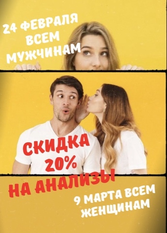 24 февраля всем мужчинам и 9 марта всем женщинам дарим скидку 20% на все анализы!
